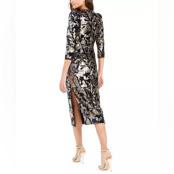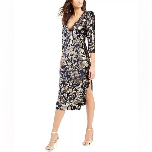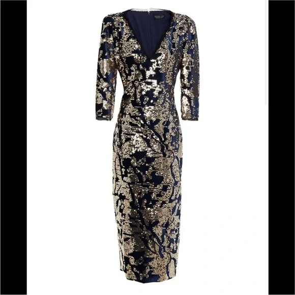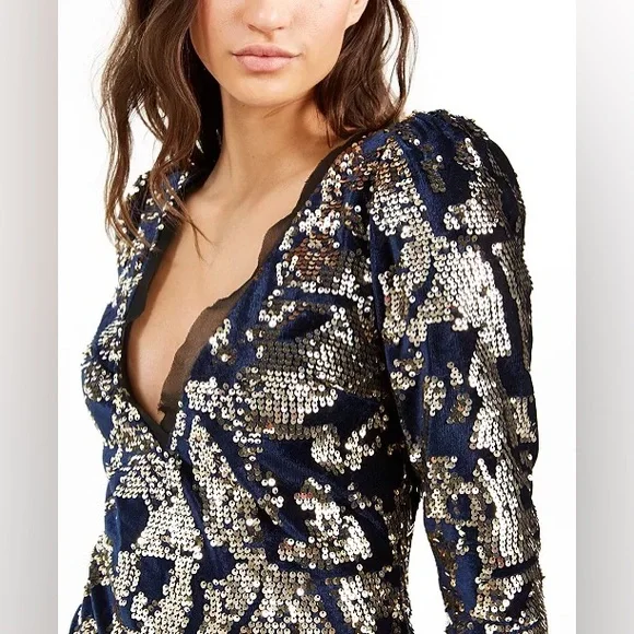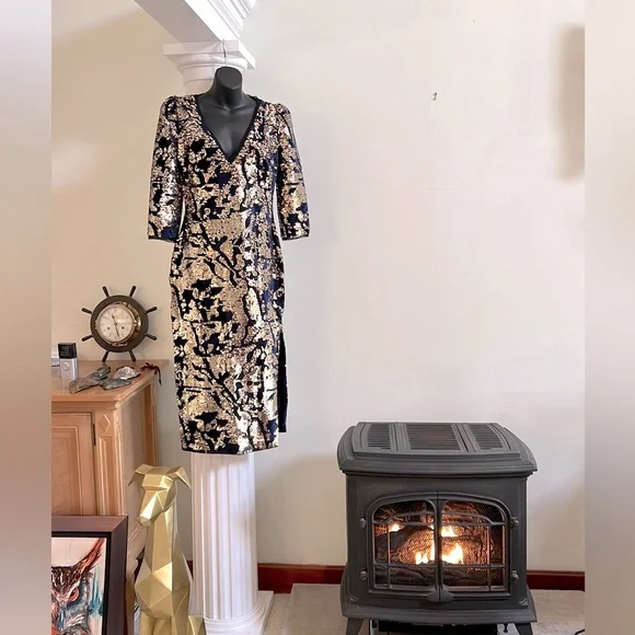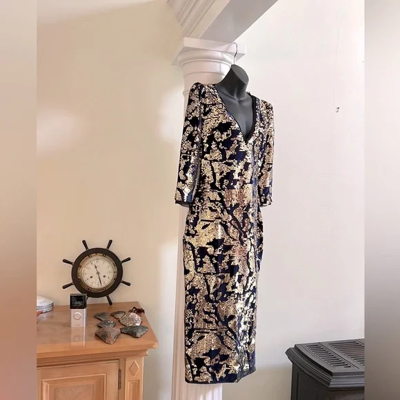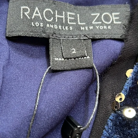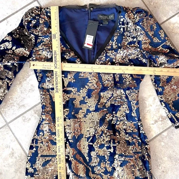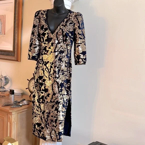 Slight gathers at the shoulders and deep V Neckline -Just stunning color Palette. Get ready to turn heads in this stunning Rachel Zoe velvet sequined evening dress. The midnight navy color is the perfect backdrop for the shimmering gold sequins, creating a truly unique and eye-catching look.The 3/4 sleeves add a touch of sophistication, while the small size ensures a flattering fit for those with a petite frame.Whether you're attending a black-tie event or a formalevening affair, this dress is sure to make you feel like the belle of the ball. Elevate your evening wardrobe with this luxurious andglamorous piece