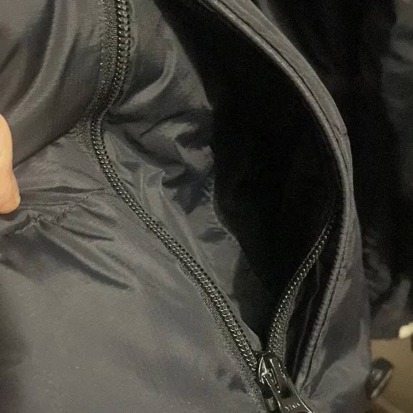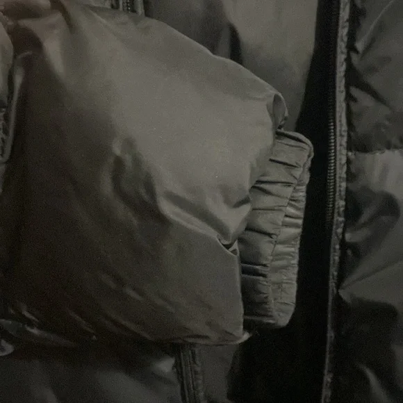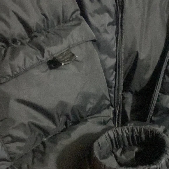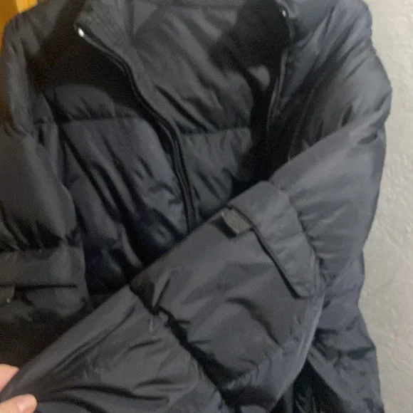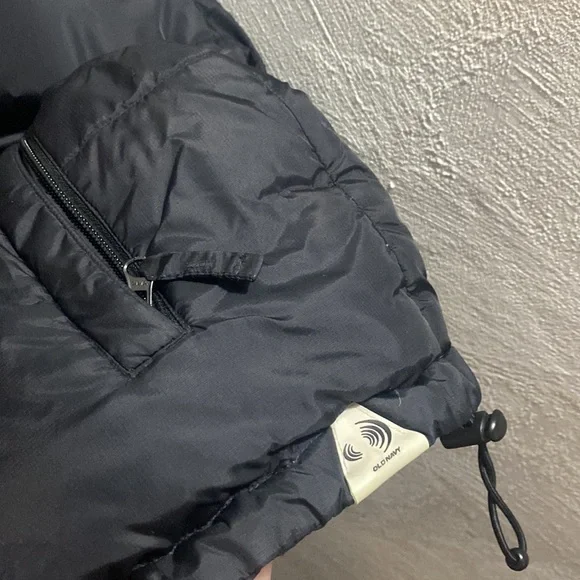 Really amazing black thick well made puffer jacket by Old Navy reversible with zipper pockets on one side & sleeve side pockets. Down light & warm in a big size 25 across the chest and 30 down w sleeves 23” down from the seam. Cool look & this has two Velcro pocket on the top of the sleeve on each side with a nice sheen to it like a waterproof coat feel.